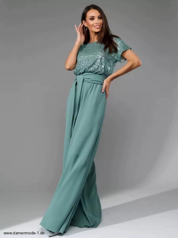 Einführung » Neuheiten 2026 » A Linie Einteiler Jumpsuit Gaby mit Glitzer Oberteil in Grün Elegant und Festlich