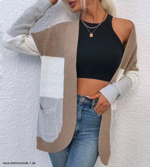 Einführung » Neuheiten 2025 » Damen Cardigan Strickjacke Eireann mit Kontrastfarben Beige