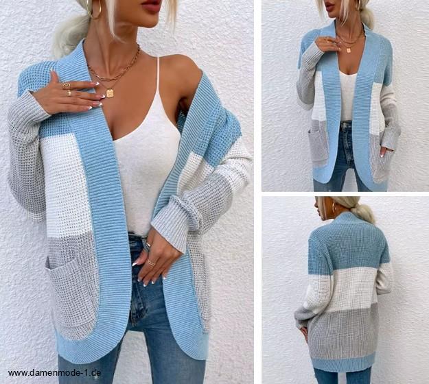 Einführung » Neuheiten 2025 » Damen Cardigan Strickjacke Ester mit Kontrastfarben Blau