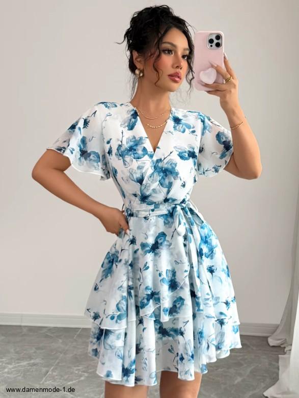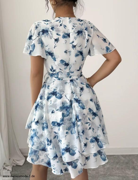 Einführung » Neuheiten 2026 » Kurzes Chiffon Sommerkleid Ganya Weiß Blau mit Blumenmuster