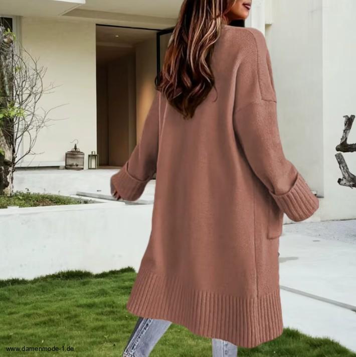 Einführung » Neuheiten 2026 » Lange Damen Strickjacke Gabriele mit Taschen in Caramel
