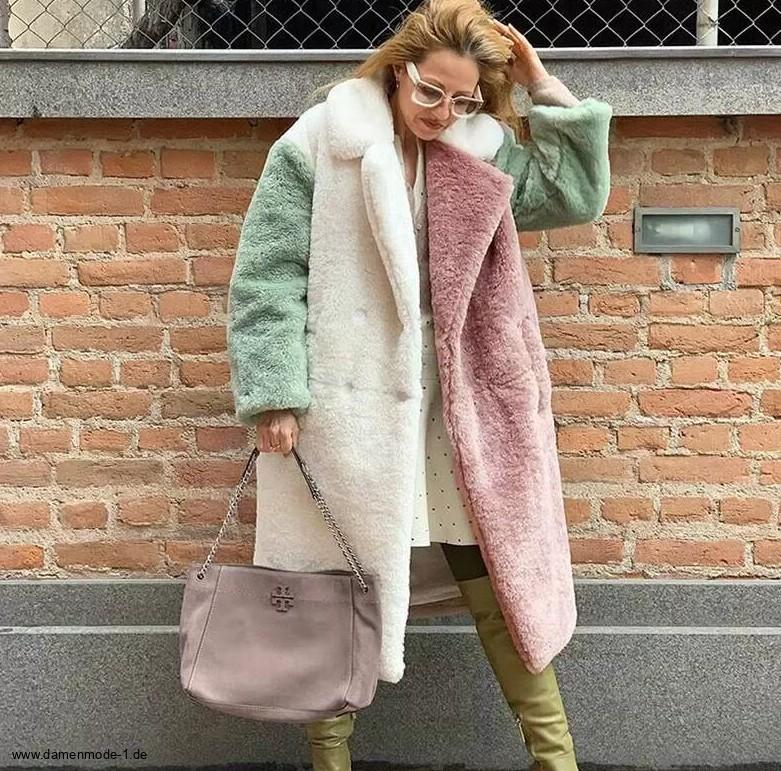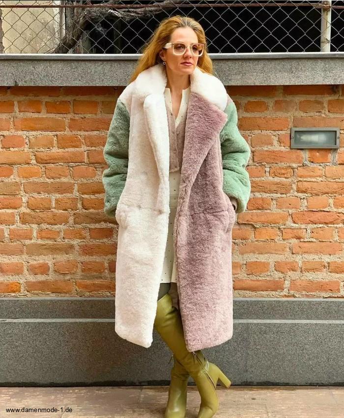 Langer Plüsch Damen Mantel Dreifarbig