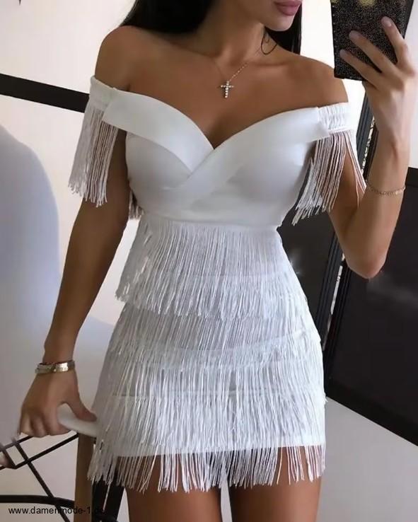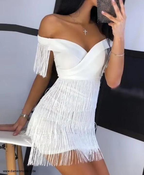 Schulterfreies Mini Kleid in Weiß Sexy mit Fransen