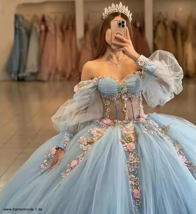 Einführung » Neuheiten 2025 » Schulterfreies Prinzessinnen Glitzer Ballkleid Elisabeth mit Lingerie Oberteil Tüll Ärmeln und Blumen Hellblau