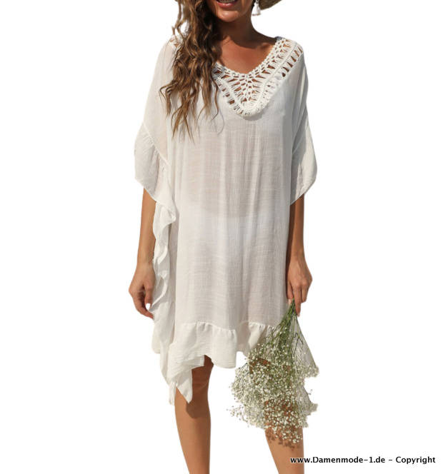 V-Ausschnitt Sommer Strandkleid Knielang in Weiß